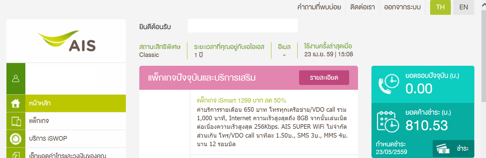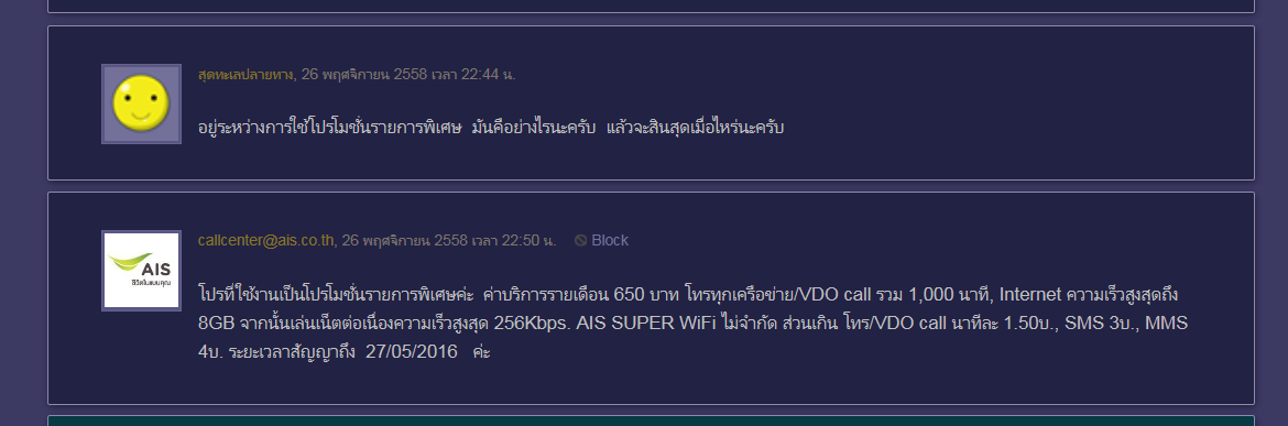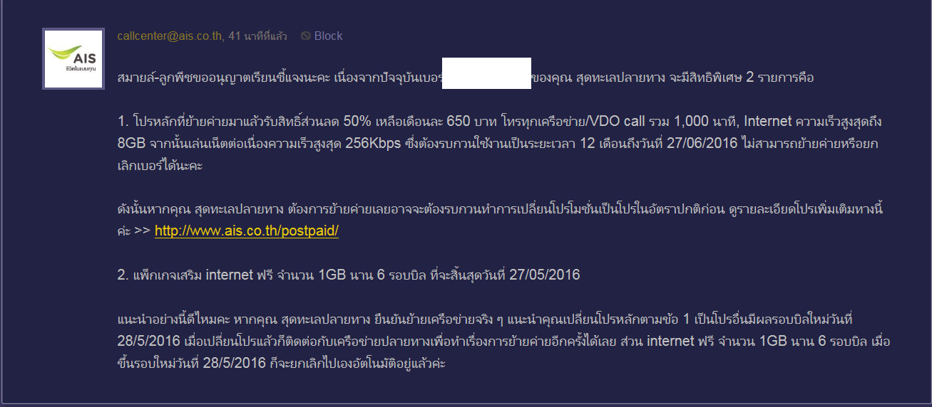 ย้อนกลับต้นเดือน11/58 ผมทำเรื่องย้ายค่ายไปดีแทค ก็มีพนักงานโทรมาอ้อนวอนไม่ให้ย้ายและพูดวกไปวนมาอยู่ตรงนั้น เขาเสนอรับสิทธิพิเศษ ฟรี Internet จำนวน 1GB นาน 6 รอบบิล ซึ่งคนอยากย้ายใครจะรับสิทธ ในเมื่อเขายัดมาให้ผม ผมแจ้งยกเลิกสิทธ ทางเอไอเอสรับทราบแต่ไม่ยกเลิกสิทธ เขาก็ยกว่าโปรผมต้องอยู่ในเครือข่าย12เดือน และผมก็ได้ถามทางccว่าผมจะย้ายออกได้เมื่อไหร่ ทางccแจ้งว่าโปรที่ใช้งานเป็นโปรโมชั่นรายการพิเศษค่ะ ค่าบริการรายเดือน 650 บาท ระยะเวลาสัญญาถึง 27/05/2016 ค่ะ
