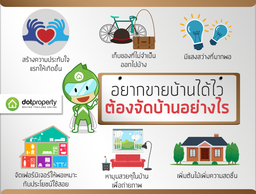 ด้วยเศรษฐกิจปัจจุบันนี้การจะขายของต่างๆก็ว่าลำบากแล้ว ยิ่งเป็นบ้านที่มี ราคาในการซื้อขายค่อนข้างสูงแล้วยิ่งทำให้การขายค่อนข้างเป็นไปได้ยาก แต่วันนี้เรามีวิธีเพิ่มความน่าสนใจให้บ้านของคุณ ด้วยการ จัดบ้าน ให้สามารถขายได้เร็วขึ้นมาฝาก ส่วนจะมีอะไรบ้างนั้น มาดูกันเลย