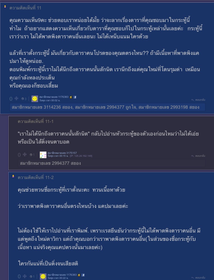คือเราตั้งถึงใหม่ ดาวิกา แล้วช่วยบอกหน่อยว่า เนื้อความตรงไหนที่เราสื่อถึงชมพู่ ที่เราพาดพิงชมพู่ หรือพิมพ์เนื้อหากดชมพู่ เรายอมรับค่ะว่ากระทู้ก่อนๆเราบลั๊ฟชมพู่ แต่กระทู้นี้เราไม่มีเจตนาเลย เรายัง งง กับที่คุณไอดี3175157. มาว่าเราตั้งกระทู้นี้เพราะเราไม่ชอบชมพู่ เราอยากรู้ว่า เนื้อข่าวมันเกี่ยวกับชมตรงไหนหรอคะ เพราะข่าวที่ดราม่ามีแค่ ใหม่ เจ้าของแบรน. ละก็คนที่เข้าไปด่าใหม่ แล้วเนื้อหาที่พิมพ์เราก็พูดถึงคนที่ด่าใหม่ คือเรา งง. จริงๆ