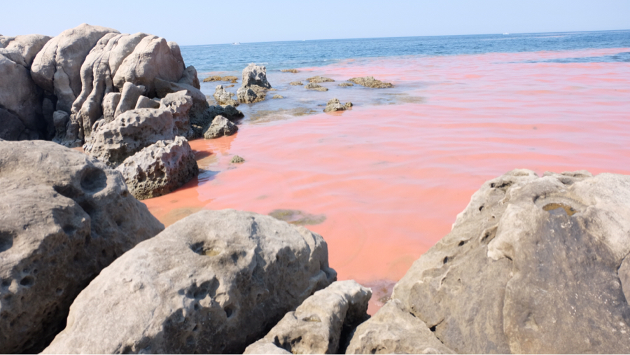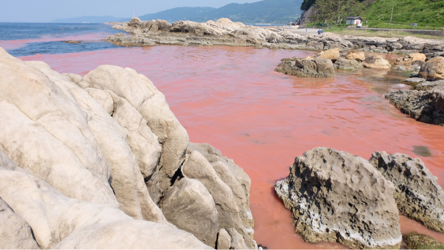 ทะเลที่เป็นสีชมพู ถามเพื่อนญี่ปุ่นว่าคืออะไร เค้าบอกมาว่าเป็นประมาณปะการังที่ตาย อันนี้ก็ไม่แน่ใจเหมือนกันครับ