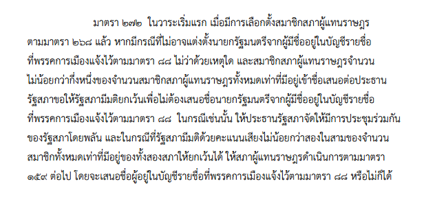 - ไม่ใช่แล้วแบบนี้ สิ่งที่คุณนำเสนอมันดูดีและโลกสวยเกินไปแล้วครับ ผมกังวลว่าคนที่เข้ามาดูคลิปคุณแบบง่ายๆแล้วจะเข้าใจผิด นายกฯคนนอกจริงๆแล้วที่มาก็คือตามมาตรา 272 ตามภาพนี้