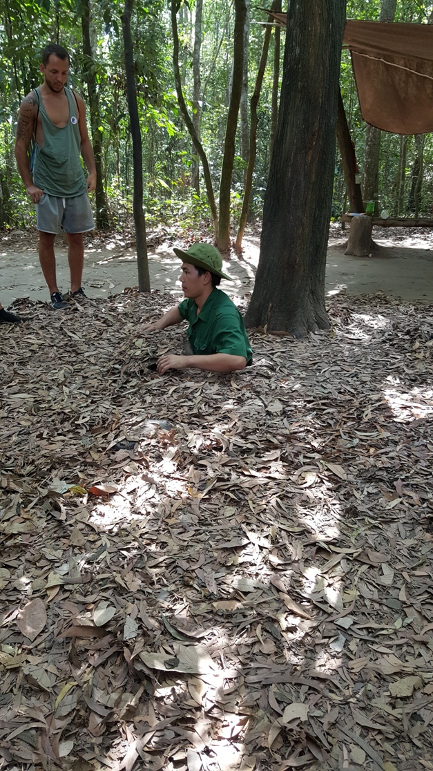 กินเสร็จก้อเดินไปรอขึ้นรถทัวร์ไปเที่ยวอุโมงค์กู้จี่ ไกด์คนเวียดของเรานิอย่างฮา พาเดินทัวร์ ดูแลดี จำลูกทัวร์ได้ทุกคน มีแจกทิชชู่ให้เช็ดมือด้วย สถานที่นี้เป็นอุโมงค์ช่วงสงคราม คนเวียดนามนิตัวเล้กเล็ก อุโมงเล็กแคบเตี้ย แอบกลัว