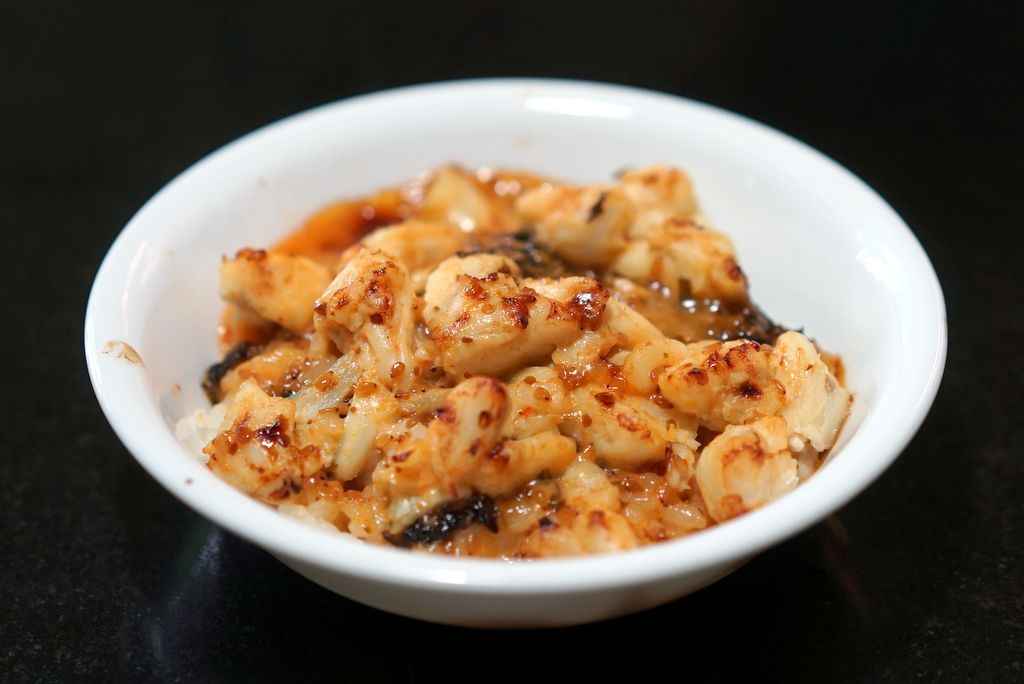 ข้าวซูชิใส่ถ้วยใบเล็ก โรยหน้าด้วยสาหร่าย ตามด้วยเนื้อปู และ ราดหน้าด้วยมายองเนสผสมซอสพริก นำไปอบ