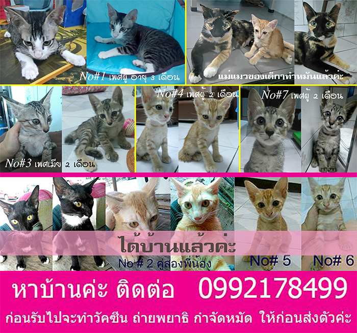 **สาเหตุที่ต้องมีข้อแม้ในการหาบ้านเพราะเคยเจอคนที่รับไปมาหลายรูปแบบ บางคนรับไปพอถึงเวลาไม่สบายไม่พาไปหาหมอ หรือเอาไปปล่อย บางตัวเลี้ยงปล่อยโดนหมากัดหรือถูกรถชน** ต้องขอโทษด้วยนะคะที่ต้องตั้งเงื่อนไขแบบนี้ขึ้นมา เพราะเจอปัญหามาเยอะค่ะ แต่ถ้าสนใจติดต่อได้นะคะ 0992178499 เพราะพวกเค้าจะอยู่ที่พักชั่วคราวได้อีกไม่นานค่ะ ขอบคุณมากๆๆๆค่ะ