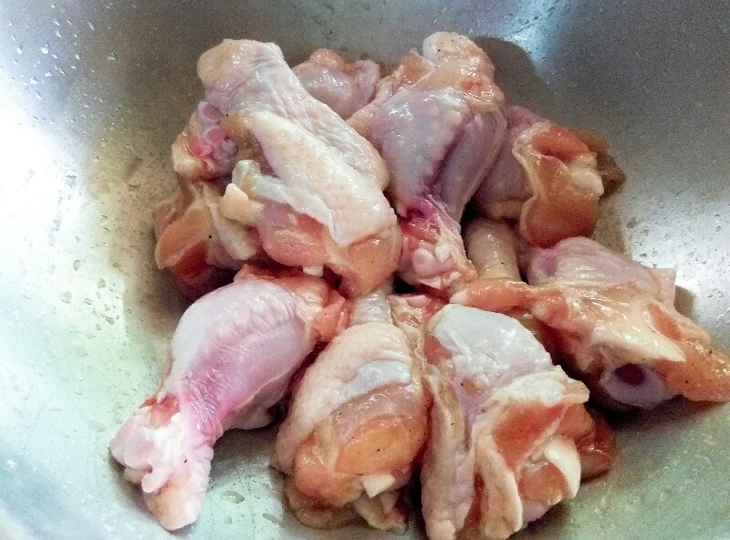 ล้างปีกบนไก่ให้สะอาดแล้วหมักด้วยเกลือ+พริกไทย พักไว้ชั่วครู่นึง