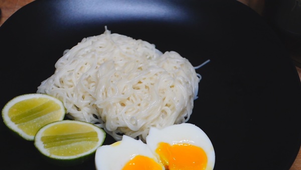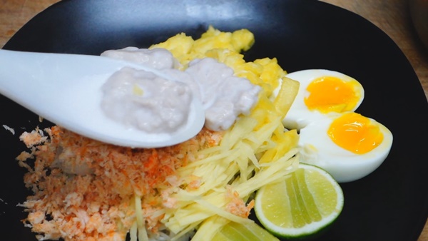 กะทิสำหรับราดขนมจีน ก็เสร็จแล้วคราวนี้ก็มาจัดใส่จานรับประทานกันได้แล้วค่ะ เริ่มด้วยเอาเส้นขนมจีนใส่จาน จัดการ ผ่าไข่ยางมะตูม