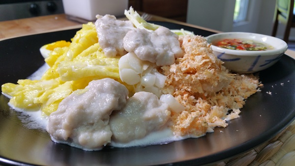 ใส่เคครื่องครบแล้วเราก็จัดการเอาน้ำกะทิที่เราทำพรร้อม ลูกชิ้น (แจงลอน) มาราดให้ชุ่ม ๆ นะคะ อย่าราดน้อยไม่อร่อย เวลาคลุกจะได้ฉ่ำ ๆ น้ำกะทิค่ะ