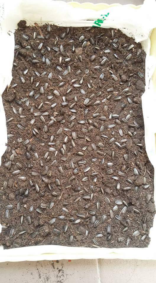 เริ่มจากลงเมล็ดทานตะวัน ต้องค่อยๆหยิบเรียงทีละเมล็ดเพื่อไม่ให้เมล็ดหนาเตอะ และจับกลุ่มเป็นก้อน เพราะเดี๋ยวโตมาไม่สวย แย่งอาหารกันอีก คริๆ แถมได้ฝึกสมาธิด้วยนะคะ (จับเรียงหัวชนกันสะเปะสะปะน่าดู อิๆ) เรียงเสร็จแล้วต้องเอาดินโปรยกลบหน้าด้วยนะคะแล้วก็รดน้ำให้ชุ่ม นำไปตั้งไว้ในที่ไม่โดนแสงแดดสักสองสามวันคะ