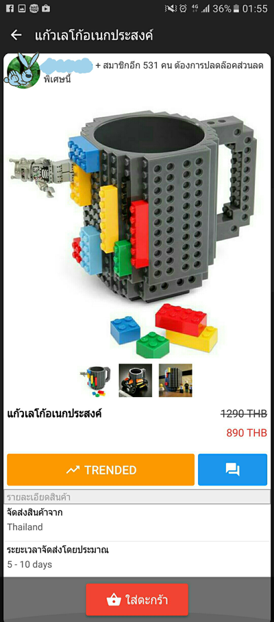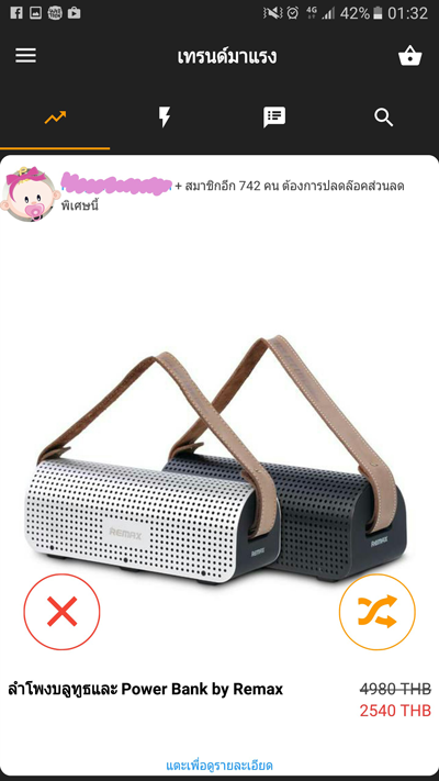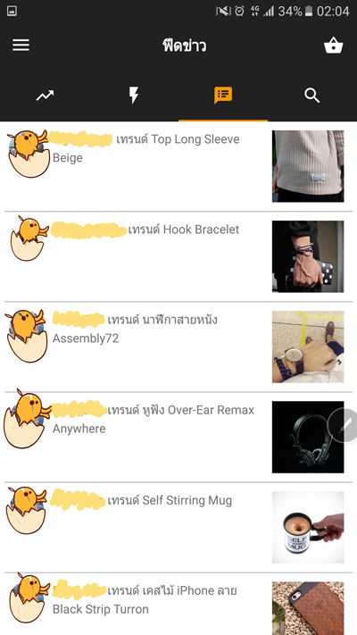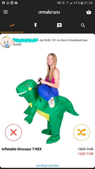 ก็จะขึ้นรูปสินค้าใหญ่ๆ พร้อมชื่อสินค้า และราคา ซึ่งวิธีการเลือกของในแอพนี้จะไม่เหมือนแอพอื่นๆ ตรงที่ใช้การ Swipe หรือการปัดซ้าย - ขวาในการเลือกซื้อสินค้า หลักการ Swipe มีง่ายๆ เลยคือ ถ้าเราชอบสินค้าชิ้นนี้เราก็ Swipe ไปทางขวาเรียกว่าการเทรนด์ ถ้าเราไม่สนใจสินค้าชิ้นนี้เราก็ Swipe ไปทางซ้ายค่ะ ซึ่งพอเรา Swipe ไปทางซ้ายแล้ว ของชิ้นนี้ก็จะไม่ขึ้นมากวนสายตาเราในการเลือกซื้อของครั้งนี้อีกต่อไปค่ะ พอเรา Swipe กันไปพอสมควร เจ้าแอพพลิเคชั่นก็จะบอกเราว่า เราเทรนด์ของไปเยอะแล้วนะไปดูของที่เราเทรนด์กันเถอะ เริ่มสงสัยแล้วใช่ไหมคะ ว่าจะกลับไปดูของที่เราเทรนด์ไว้ได้ยังไง