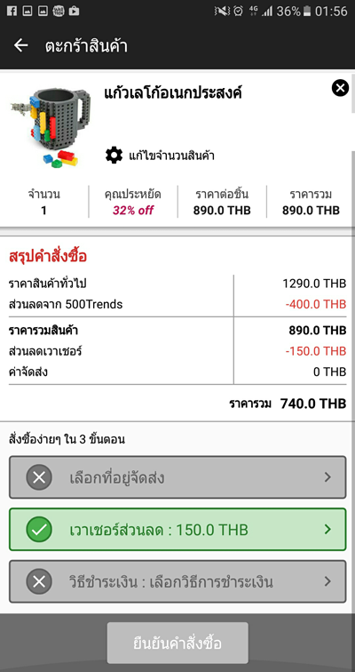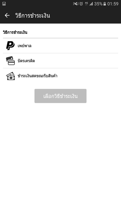 ขั้นตอนที่ 2 เป็นเว้าเชอร์ส่วนลดค่ะ ซึ่งถ้าเรามีอยู่แล้วแอพพลิเคชั่นจะดึงมาใช้ให้เราโดยอัตโนมัติค่ะ ขั้นตอนสุดท้าย เป็นวิธีชำระเงิน ซึ่งเราสามารถเลือกได้ว่า จะจ่ายจาก Paypla จากบัตรเครดิต หรือจ่ายเงินปลายทางเมื่อได้รับสินค้าค่ะ