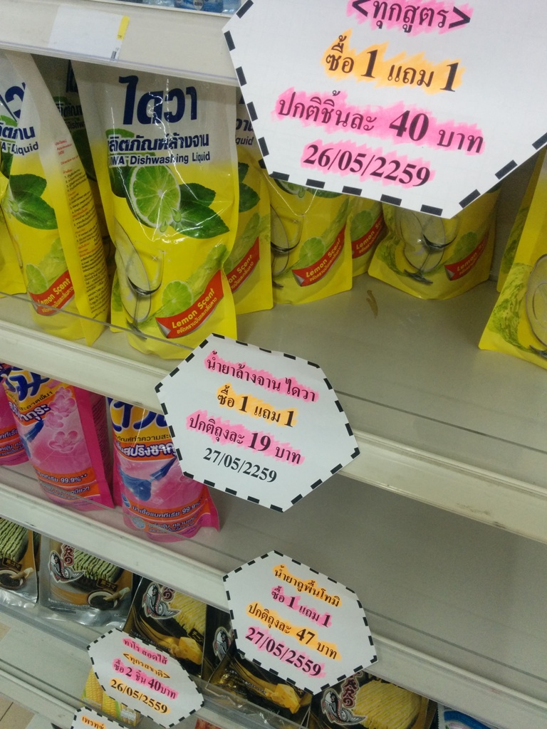 วันนี้(26 พ.ค. 59 เวลาประมาณห้าทุ่ม) ผมก็ได้เข้าไปซื้อของที่ 7 ตามปกติครับ แล้วทีนี้ผมเจอน้ำยาล้างจานในร้านวางอยู่พร้อมป้าย ซื้อ 1 แถม 1 และมีวันที่บอกไว้ด้านล่าง 27/05/2559 ตามรูปครับ