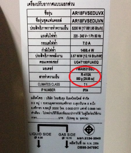 ปริมาณน้ำยาแอร์เราสามารถ ดูได้จากเนมเพลทของแอร์ หรือ แคตตาล๊อคของแอรตัวนั้น เช่น