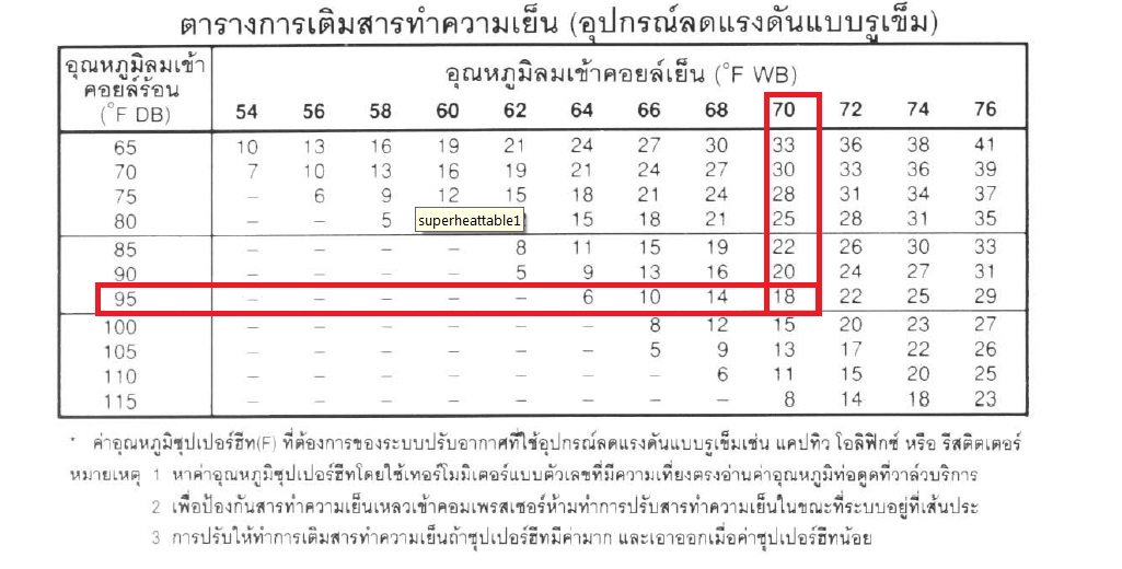 3 อ่านค่า ความร้อนยิ่งยวดจากตาราง ที่อุณหภูมิลมเข้าคอยล์ร้อนได้ 95 °F และ อุณหภูมิกระเปาะเปียกลมเข้าคอยล์เย็นได้ 70 °F จะได้ค่า เท่ากับ 18 °F ตามรูป