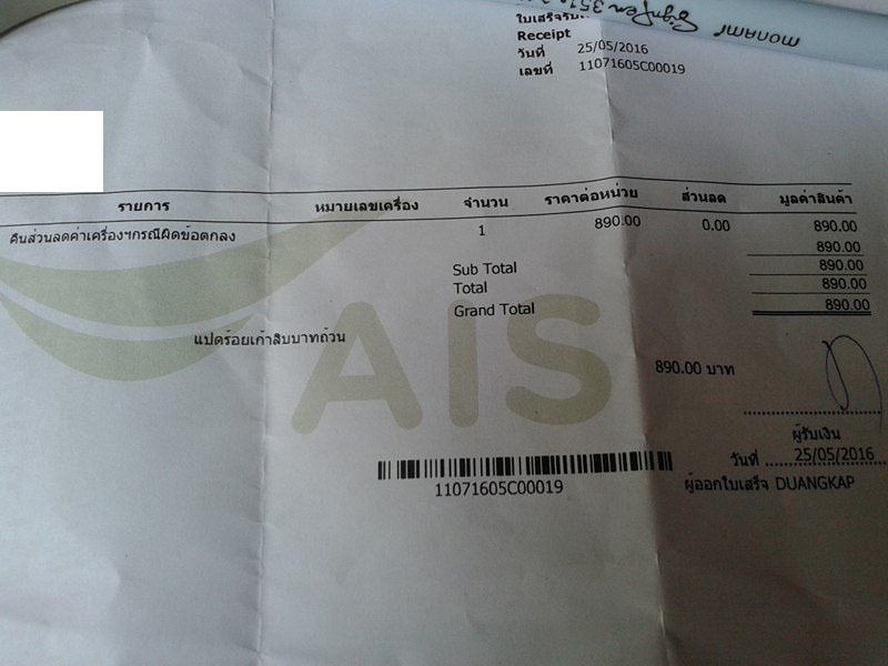 พุธ 25/05/16 ไปที่ 0 AIS แฟชั่นไอส์แลนด์ ทำเรื่องปิดสัญญา พร้อมจ่ายเงินชดเชย 890 บาท