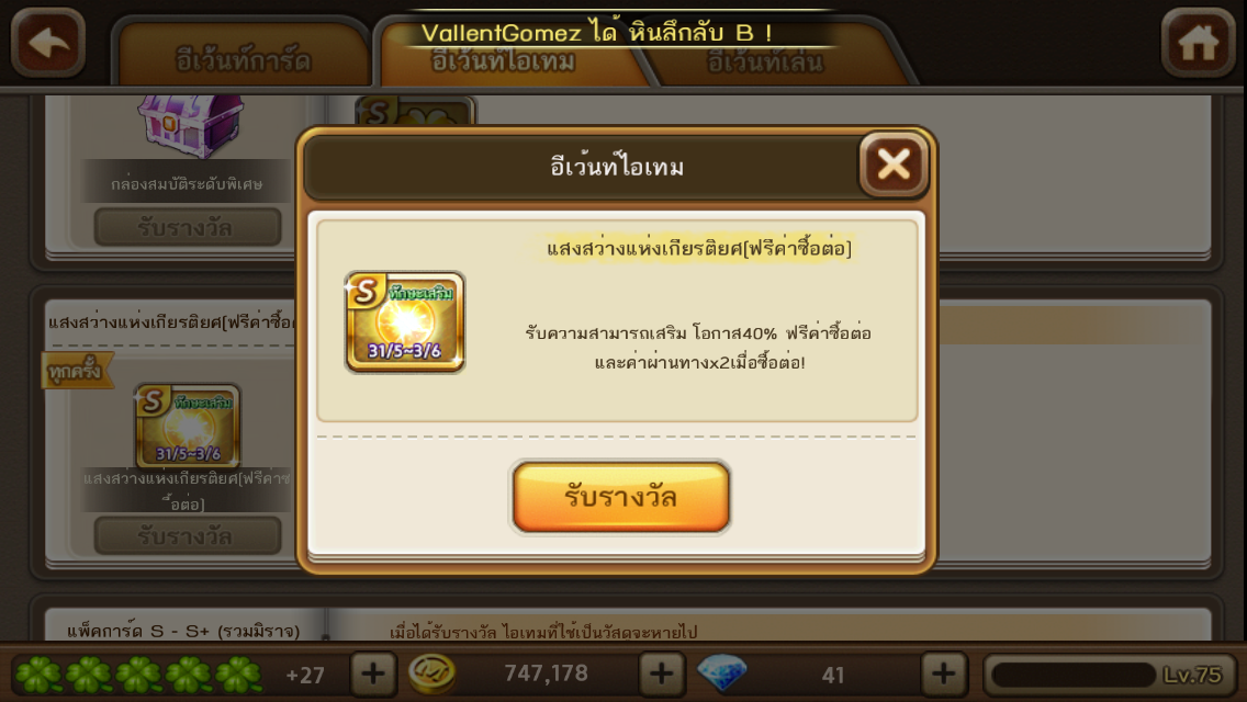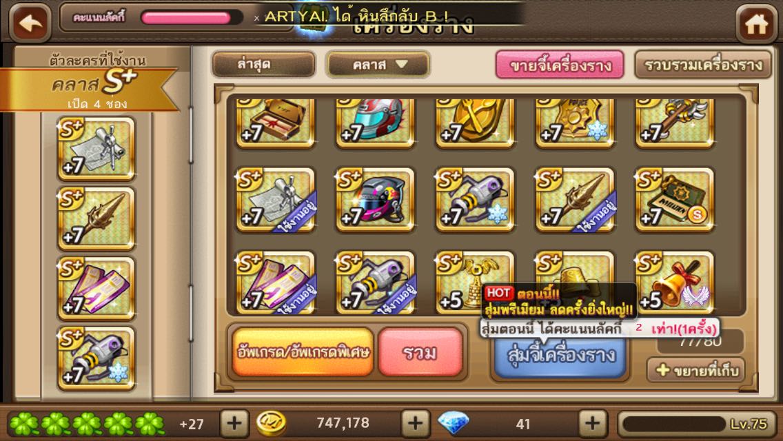 พอดีผมจะลองไปลุยห้อง เพลท ดูครับ ส่วนเรื่องจี้ กับตัวละคร ก็มีดังนี้นะครับ การ์ดบอย S+ 30 จี้เครื่องรางที่มีอยู่คือ 1.เล็บอินทรี S+ +5 ความสามารถ เพิ่มคู่/คี่ +1 2.หมวกกันน๊อค S+ +5 ความสามารถ โอกาส