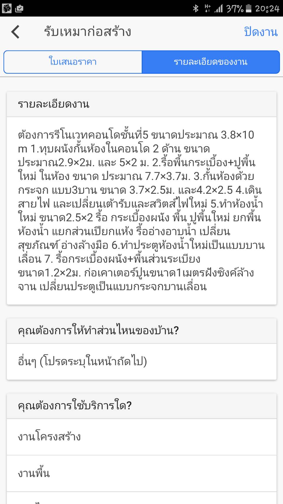 เราซื้อบ้านเก่ามารีโนเวทเพื่ออยู่อาศัย ติดต่อผู้รับเหมามาประเมินราคา มีหลายส่วนที่ต้องแก้ไขปรับปรุงบ้าน มีงานรื้อปูกระเบื้องใหม่ในห้องน้ำ2ห้อง ทาสีทั้งภายนอกภายใน รื้อปาเก้ ทำฝ้าใหม่ ปูหลังคาใหม่ แล
