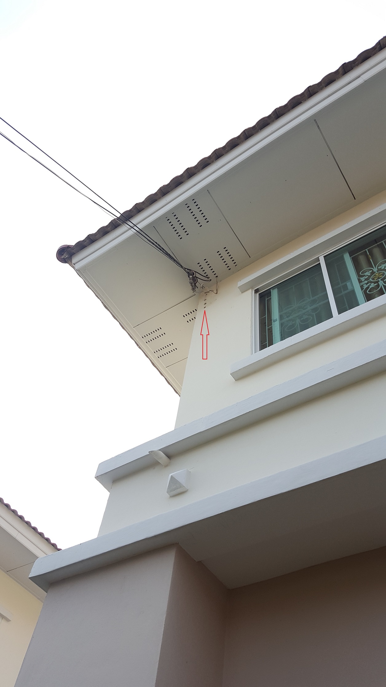 บ้าน townhome 2 ชั้น หลังตรงกลาง -ส่องไฟฉายบนฝ้า ตรงมุมซ้ายบนของรูป มีรอยขีดสีดำยาวสัก 10 เซนติเมตร ใช่รอยแตกของผนังไหมครับเหมือนเป็นรอยตรงมุมระหว่าง2ผนังชน หรือเป็นวัสุดแปะครอบหลังคาแล้วมันร้อนจนล