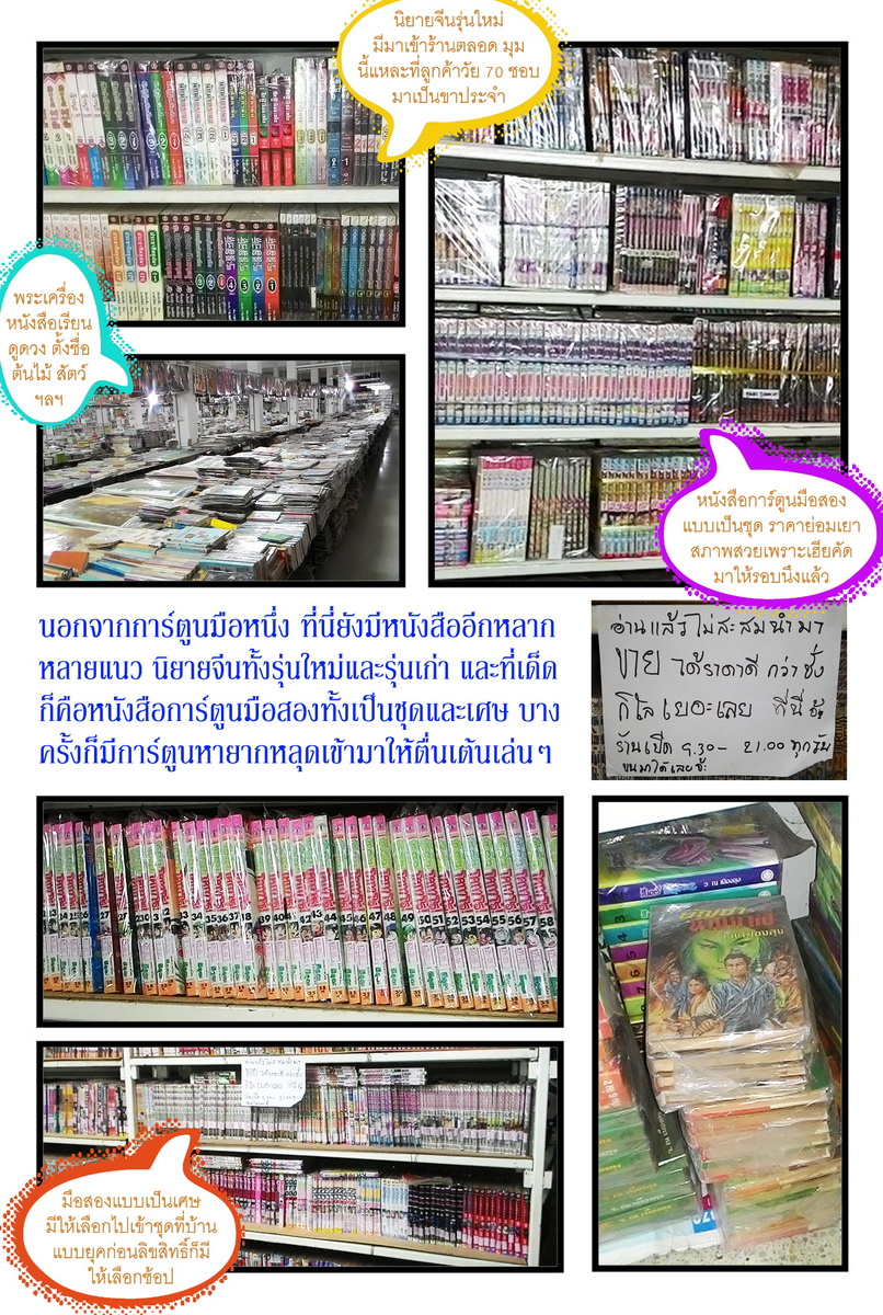 ✰ เฮียเล็ก : เด็กยุคนี้ไม่อ่านหนังสือการ์ตูนกันแล้วจริงๆ หันไปเล่นมือถือกับคอมพิวเตอร์กันหมด ถามเด็กแถวๆ นี้เขาก็อ่านก็ดูการ์ตูนกันอยู่นะแต่พวกเค้าบอกว่ามันหาอ่านฟรีในเน็ทได้ ทำไมต้องจ่ายเงินซื้อด้วย เอาเงินไปเติมเน็ทดีกว่า อ่านการ์ตูนก็ได้ ดูการ์ตูนก็ได้ (Admin : เฮียคงหมายถึงการ์ตูนอนิเมะ) เล่นเกมก็ได้ โซเชียลก็ได้ ลูกค้าที่เหลืออยู่ส่วนใหญ่อยู่ในวัย 30 ขึ้นไปจนถึงวัย 70 โน่นเลย