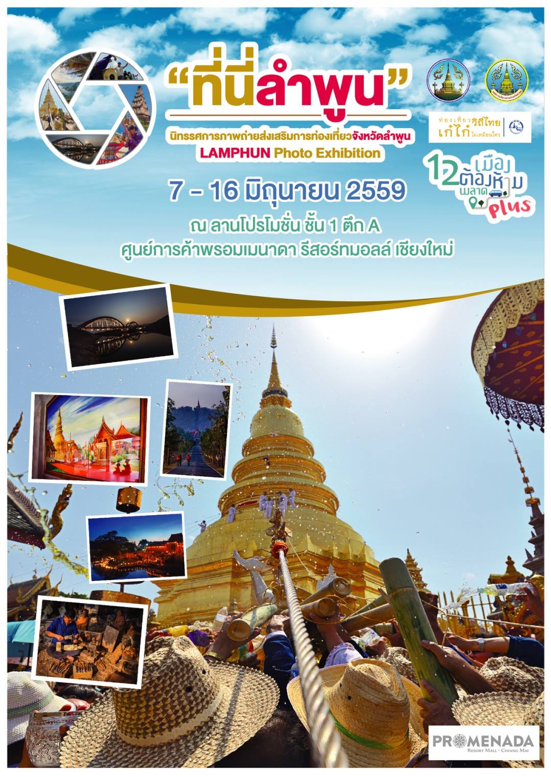 องค์การบริหารส่วนจังหวัดลำพูน จัดงาน นิทรรศการภาพถ่ายส่งเสริมการท่องเที่ยว จังหวัด ลำพูนในหัวข้อ “ที่นี่ลำพูน” Lamphun Photo Exhibition “12 เมืองต้องห้ามพลาด Plus”ซึ่งงานจัดระหว่างวันที่ 7-16 มิถุนายน 2559 ณ ลานโปรโมชั่นชั้น 1 ตึก A ศูนย์การค้า พรอมเมนาดา รีสอร์ทมอลล์ เชียงใหม่