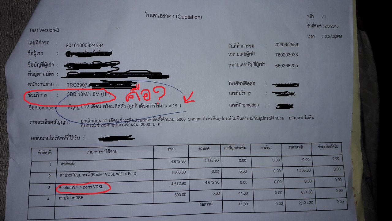 ผมอยู่จังหวัดเชียงใหม่เนื่องจากต้องย้ายบ้านเช่าจึงต้องการติดตั้งอินเทอร์เน็ต เห็นมีโปรโมชั่น VDSL ของ 3BB จึงสนใจติดต่อขอติดตั้ง VDSL 20/4 mb ที่ศูนย์ เซนทรัลเฟสติวัล (เชียงใหม่) เช้าวันรุ่งขึ้นช่างได้เข้ามาติดตั้ง ทุกอย่างเสร็จเรียบร้อย ไม่ได้ทดสอบสัญญานแต่อย่างใด มีแค่คำพูดว่า "อินเตอร์เน็ตจะสามารถเล่นได้ภายในเย็นนี้" ปรากฏว่า นั่งรอสัญญานทั้งเย็นไม่มีสัญญานอินเตอร์เน็ตเข้า จึงโทรไป ศูนย์ ได้รับคำตอบว่า สัญญานจะเข้าในอีก 1-3 วัน วันถัดมา สัญญานมาครับ วิ่งอยู่ที่ 12/1 mb หลุดบ่อยมาก ทำให้สงสัยว่าติดตั้งเน็ตแบบนี้มัน คุณภาพไม่ได้มารตราฐานจริงๆ จึงติดต่อ ศูนย์ใหญ่อีกที คำตอบที่ได้รับคือ ผมได้รับแพ็คเกจ เป็น ADSL 18/1.5 mb ผมสงสัยว่าประสานงานกันแบบไหน คุณภาพเน็ตก็แย่ การทำงานก็แย่ ถามช่าง ช่างก็งง คือ 3BB ครับใบสมัครใช้บริการติ๊กไว้ชัดเจนว่า VDSL 20/4mb ประสานงานกันแบบไหนถึงติดตั้ง 18/1.5 ADSL มาได้ หลุดบ่อย สัญญานไม่เสถียร ช่วยดูแลลูกค้าหน่อยนะครับ