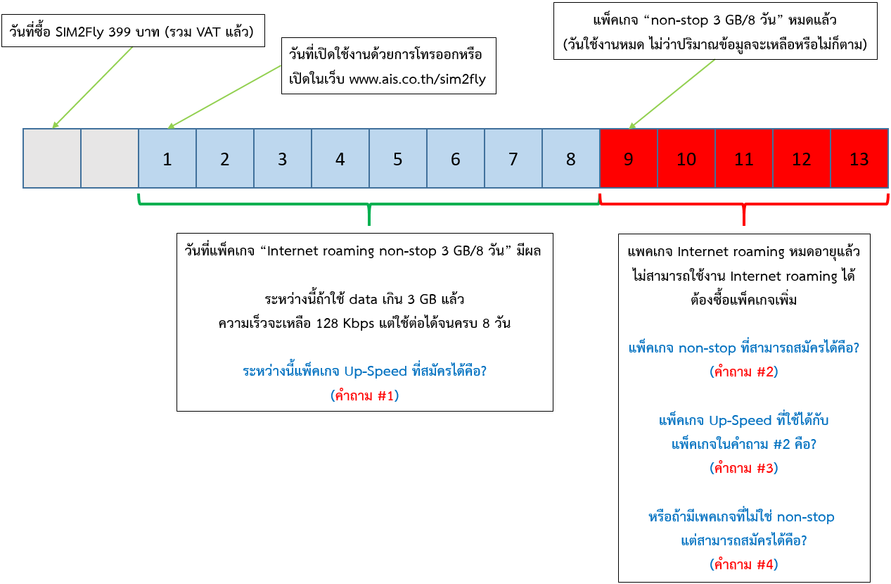 อ้างอิงตามรูปนะครับ เพื่อจะได้เข้าใจตรงกันว่าแต่ละคำถามถามถึงช่วงเวลาไหน สมมุติว่าผมจะไปญี่ปุ่นเป็นเวลา 13 วัน ซึ่งตัว SIM2Fly 399 จะครอบคลุมเพียง 8 วันแรก เลยมีคำถามตามนี้ครับ