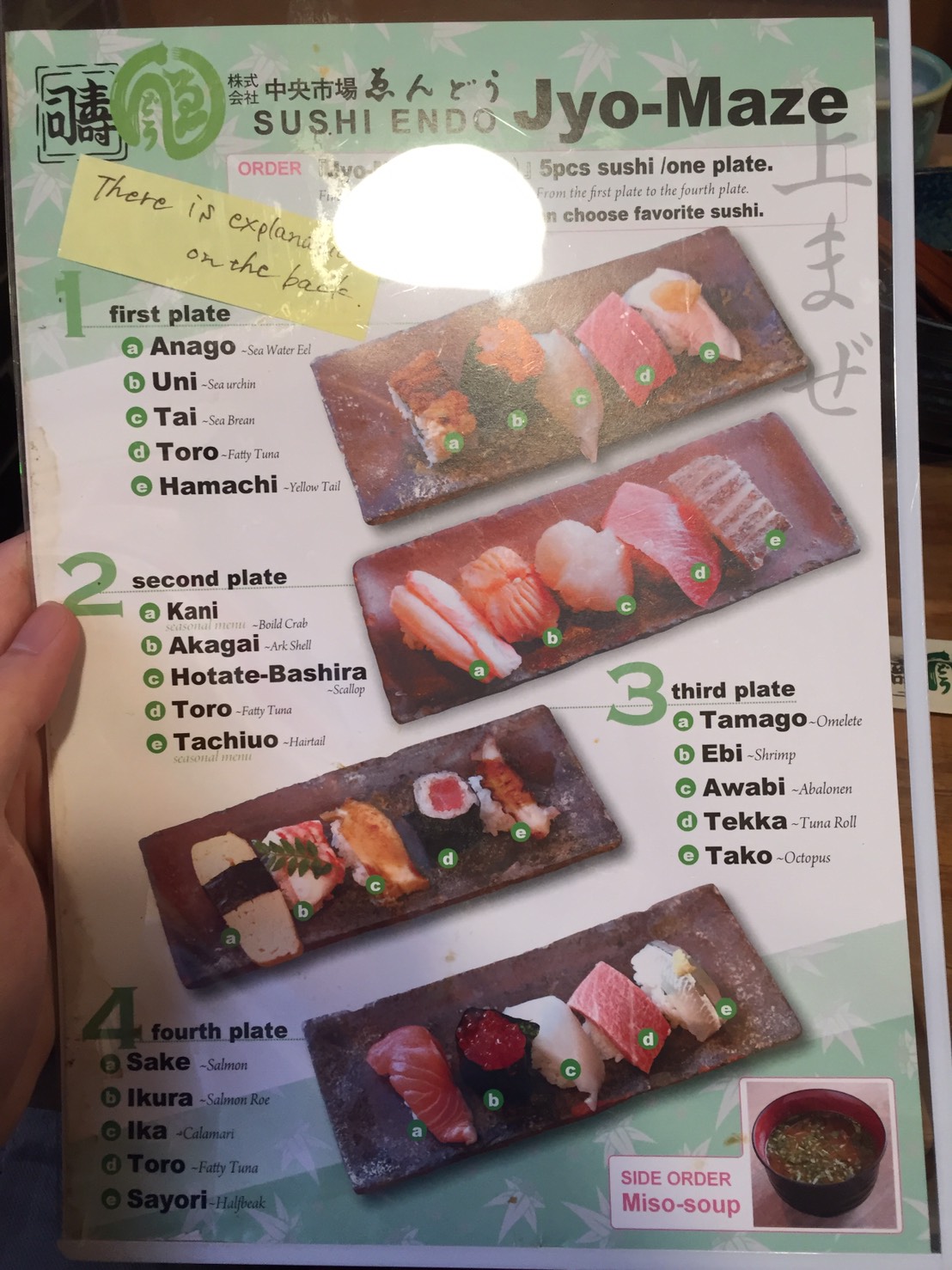 วันแรกผ่านไป จริงๆก็อย่าเรียกว่าวันแรกเลย ไปถึงก็ดึกละ วันที่สอง พวกเราแพลนกันว่ามาญี่ปุ่นทั้งที Osaka ด้วย จะต้องลองไปเที่ยว Universal ซะหน่อยแล้ว ก็เลยหาข้อมูลกัน ก็อย่างที่บอกแหละครับเที่ยวด้วยตัวเอง ไม่ค่อยมีความรู้ ก็พึ่งอาจารย์ Google นี่แหละครับ หาวิธีจองตั๋ว Universal ทำให้ผมค้นเจอว่ามันจองง่ายมาก สามารถจองได้ใน minimart เลยถ้าจำไม่ผิดนี่น่าจะร้าน LAWSON ร้านสีฟ้าๆเลย โดยที่พวกผมก็ให้พนักงานช่วยกดจองให้จากตู้ในร้านเลย พวกเราซื้อแบบ express เลยเพราะไม่อยากต่อแถวยาวๆ เสียเวลาแน่ (express ticket จะเป็นบัตรที่จะต้องเสียเงินเพิ่มเพื่อไม่ต้องต่อแถวยาวๆให้เสียเวลา หรือเรียกง่ายๆว่า ซื้อแล้วไม่ต้องต่อแถวมันมีอีกช่องให้เดินเข้าไปเล่นได้เลย แอบเหมือนแซงคนอื่นเค้าเหมือนกันนะเอาจริง- -“) หลังจากจองเสร็จก็รออะไรละครับ มาถึงญี่ปุ่นแล้ว ถ้าไม่ได้กิน Sushi ถือว่าผิด ! หลังจากนั้นผมก็อีกเช่นเคย ค้นหาข้อมูลจนเจอร้านนึงชื่อว่า Endo ซูชิ 1000 ปี ที่เค้าว่ากันว่าใครมาที่ Osaka ก็ต้องมากินร้านนี้ ผมไม่รอช้า ออกเดินทางทันที ร้านอยู่ค่อนข้างลึกนิสนึง แบบอยู่ในตลาดปลาเลย พอมาถึงหน้าร้านเหลือบไปเห็นป้ายอันนึง บอกมันจะไปเปิดที่ไทยในเร็วๆนี้ - -“