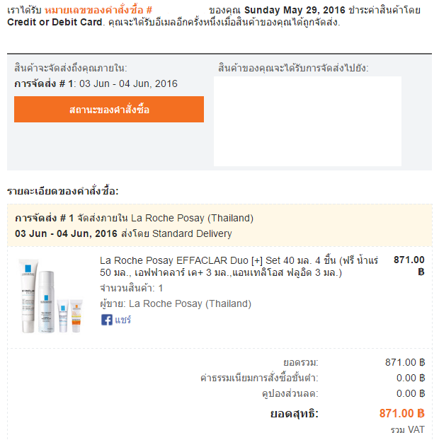 วันที่ 29 พฤษภาคม เราสั่งซื้อสินค้าจากLAZADA โดยชำระเงินผ่านบัตร ราคา 871 บาท