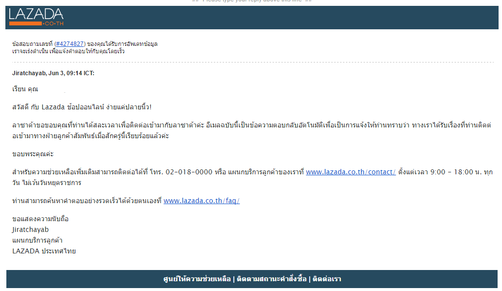 วันที่ 4 มิถุนายน เราอีเมล์กลับไปสอบถามตามอีเมล์ของ LAZADA ที่ส่งมาสวัสดีเรา แต่ก็ยังเงียบไม่มีการตอบกลับ