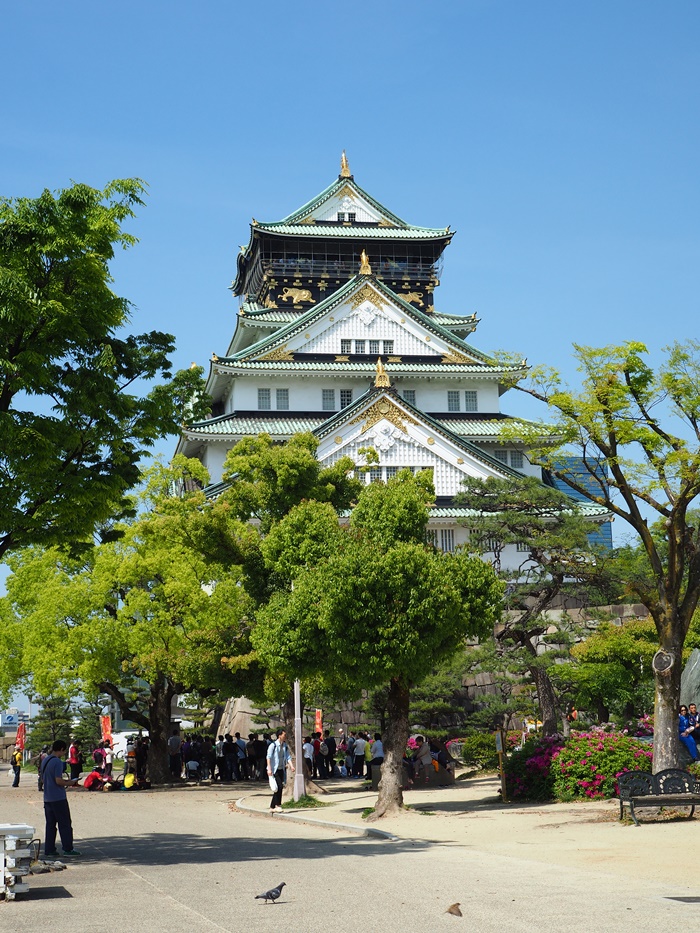 หลังจากผ่าน ตม. อย่างง่ายดายและราบรื่นเรียบร้อย เราก็นั่งรถไฟเข้าไปที่สถานีนาโงย่า เพื่อแลก JR Pass และทำการจองที่นั่งขบวนรถไฟที่วางแผนไว้ซึ่งผมได้ปริ้นไปด้วย ยื่นให้เจ้าหน้าที่จองให้ บริการดีครับ ไม่มีทีท่าว่าจะรำคาญหรือเกี่ยงงานเลย สุดยอดครับ ผมเปิดใช้ JR Pass 7 Day วันนั้นเลยครับ เสร็จแล้วก็เดินทางต่อไปยังโอซาก้า คืนนี้เราจะนอนกันที่ โอซาก้า โรงแรมชื่อ Shin Osaka Conference Center โรงแรมอยู่ห่างจากสถานี Shin-Osaka ประมาณ 5 นาที ห้องไม่ใหญ่ แคบมาก เหมาะกับคนเดียวมากกว่า หลังจากฝากกระเป๋าเสร็จ ก็ออกไปเที่ยวกัน ที่แรกที่ไปคือ ปราสาทโอซาก้า เรานั่งรถไฟไปลงสถานี Osakajokoen แล้วเดินต่อพอสมควร