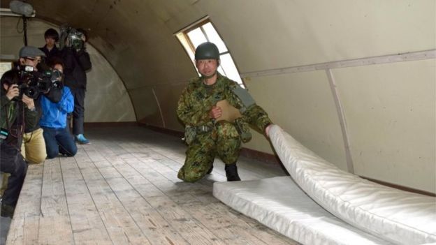 กองกำลังป้องกันตนเองญี่ปุ่นโชว์ฟูกภายในกระท่อมที่ ด.ช.ยามาโตะ ทาโนโอกะ ใช้เป็นที่พักพิงตลอด 6 วันหลังถูกพ่อแม่ทิ้งไว้กลางป่า