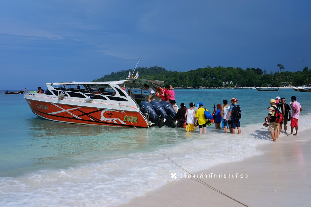 ตอนนี้ได้เวลาขึ้นเรือแล้วครับ ปกติจะใช้เวลาประมาณ 1.30 ชม. แต่เนื่องจากวันนั้นฝนตกคลื่นสูง 2.5-3 เมตร ทำให้เราใช้เวลาเดินเรือถึง 3 ชั่วโมงกว่าจะถึงเกาะครับ ยาเมาเรือ ถุงอ้วกเตรียมไปเลยครับ เรือผมอ้วกเกือนทุกคน แต่ผมลอด เป็นคนไม่เมาเรือครับ ใช้เวลาประมาณ 3 ชม. ก็ถึงเกาะหลีเป๊ะครับ นานจังเลย เหนื่อยด้วย