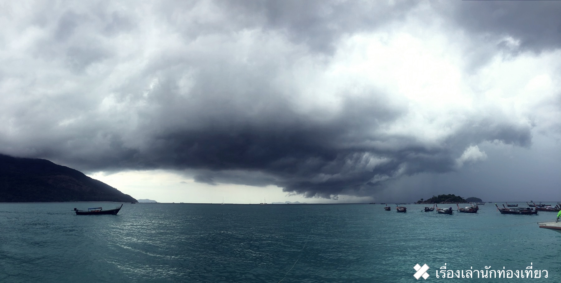 ทันใดนั้น ท้องฟ้าก็เปลี่ยนสี ตอนนั้นเป็นเวลาบ่ายโมง เราต้องรีบขึ้นเรือและกลับเกาะทันที เพราะฝนลม พายุ กำลังมา