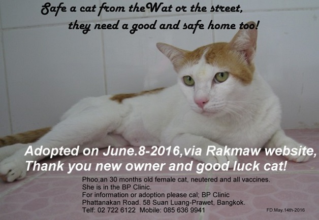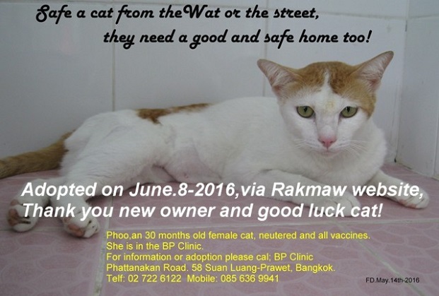 This is to inform you that the cat (Phoo) which was for weeks in the BP clinic, is adopted on June 8th.2016 by her new owner.