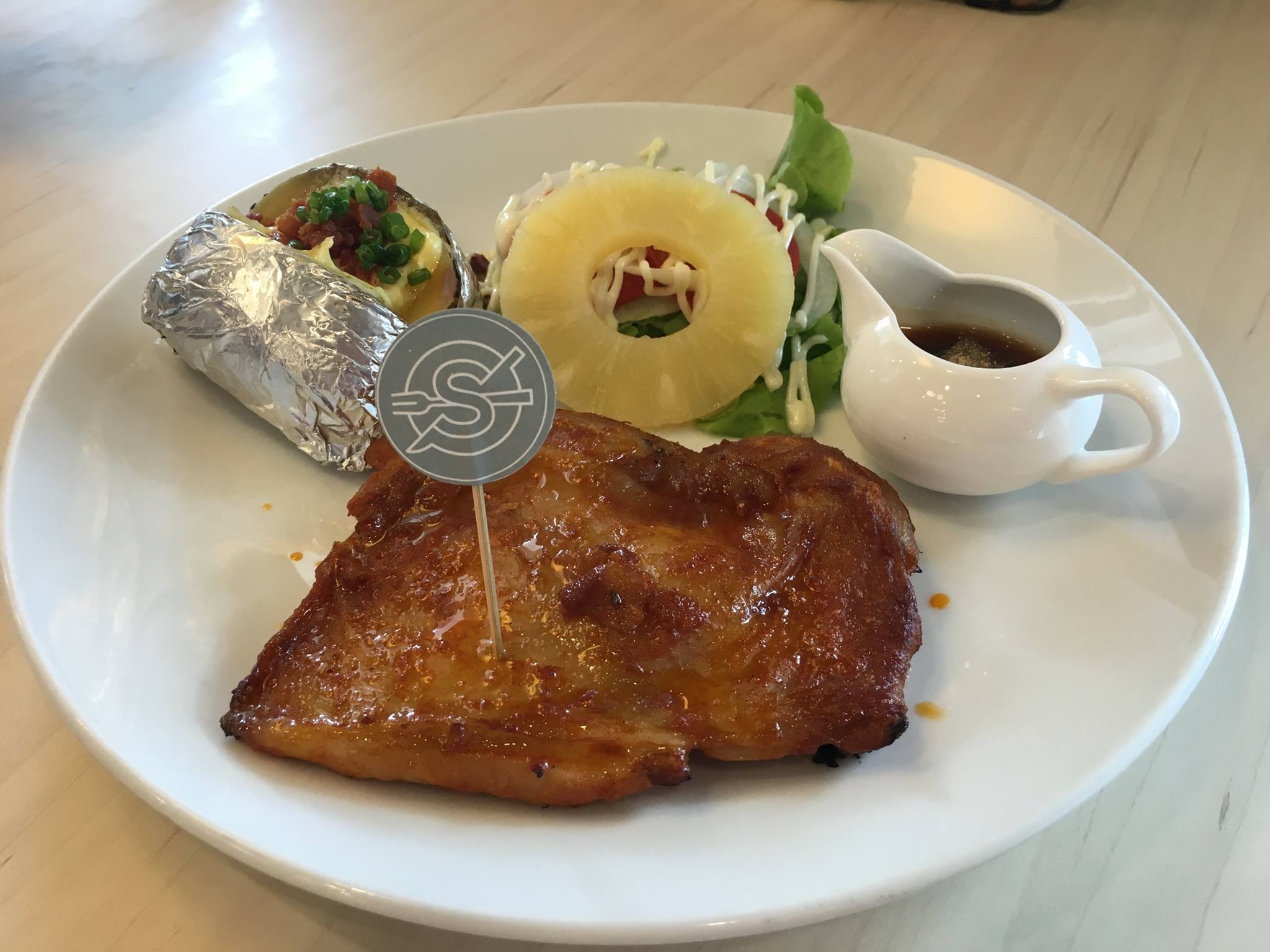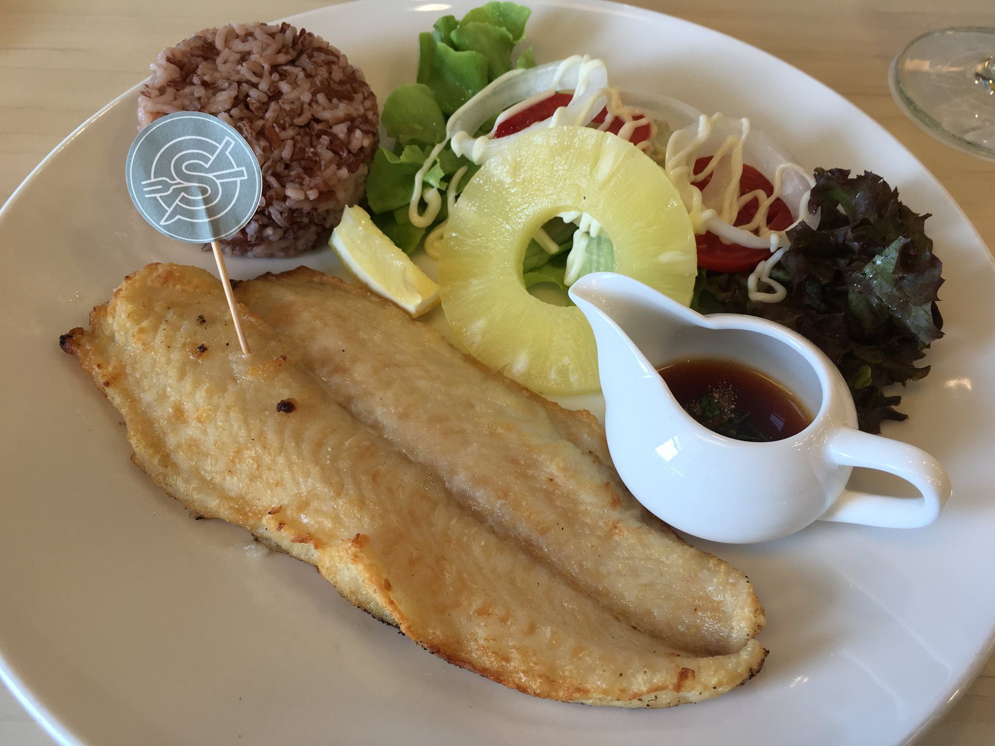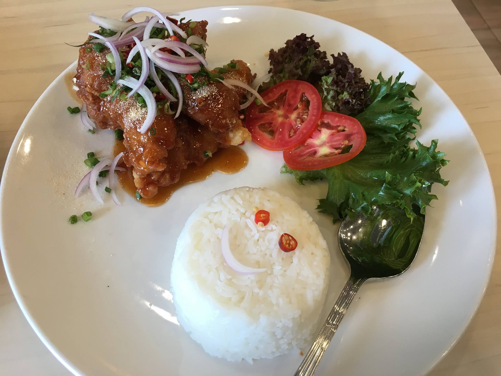 ที่ผมสั่งกินคือสเต็กไก่สไปซี่ แต่อยากก็ได้ลองชิมจานอื่นก่อน เช่นปลาดอร์รี่ของคนอื่น เป็นต้น 555 อันนี้เค็มๆนิ่มๆดี ชอบแฮะ ข้าวหน้าปลาดอร์รี่นี่ก็อร่อยนะ มันเอาปลาดอรี่ชุบแป้งทอดอะ ราดน้ำจิ้มแจ่วอีกเช่นเคย