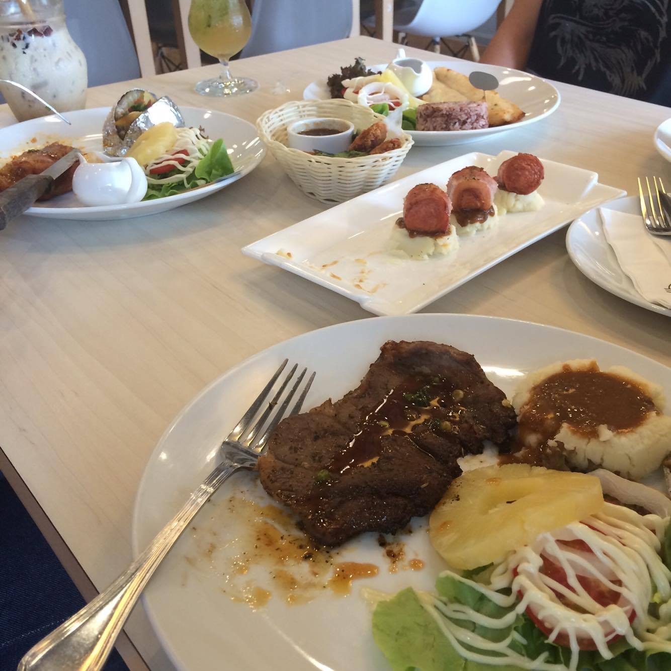 พออาหารมาเสิร์ฟที่โต๊ะ ก็ถ่ายรูปสิครับ ยังไม่กินนะ ถ่ายก่อน555 พวก 5 เมนูที่มันจัดโปร ก็ต่างกันไป เราเลือกเครื่องเคียงได้นะ จะมันอบ จะมันบด หรือเฟรนช์ฟรายหรือ.... จิงๆมันมีอีกแต่ผมลืม ที่เราสั่งๆกันมาก็มี