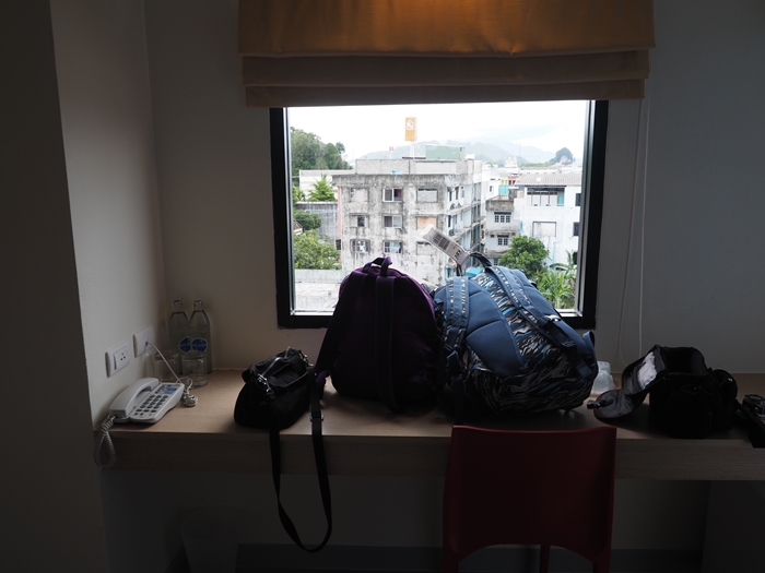 จากห้องพักมองออกไปจะให้เมืองกระบี่ มีโต๊ะยาวไว้วางของและเก้าอี้สีแดงอีก 1 ตัว
