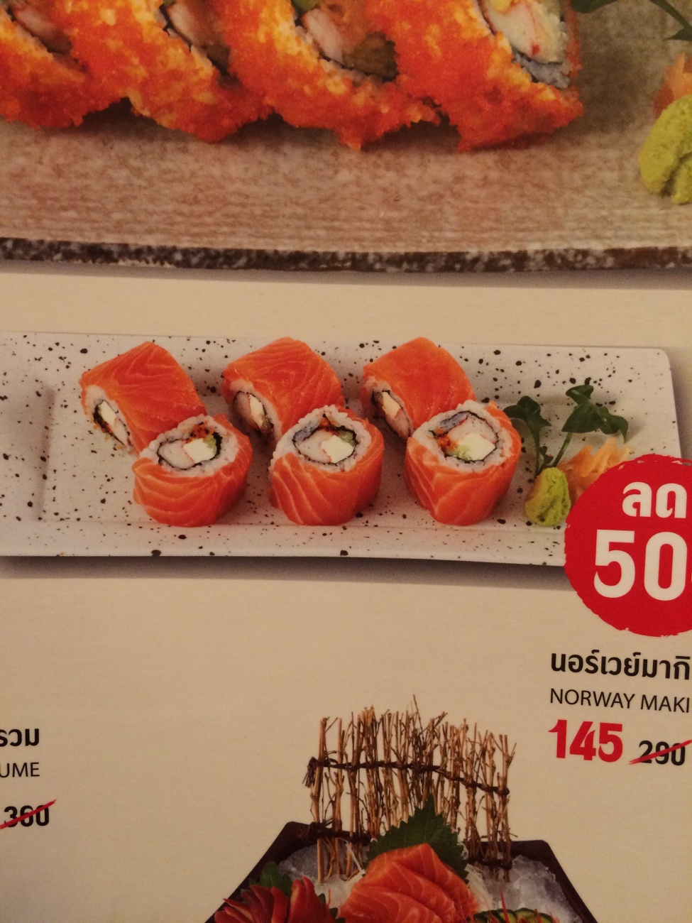 วันนี้ผมไปเดินเล่นที่เซนทรัลพระราม 9 ก็เหลือบไปเห็นร้านอาหารญี่ปุ่นลดราคาอาหารบางรายการลง 50% ก็เลยไปไปสั่งอาหารมาทานเพราะปกติก็ทานเมนูนี้ประจำอยู่แล้วครั้งนี้เลยสั่งมาสองจาน นั่งรอสักพักอาหารก็มาเสิร์ฟพอเห็นสภาพอาหารเวลามีส่วนลด 50% แล้วถึงกับต้องมองหน้ากันหน้าตาอาหารในเมนูกับของจริงมันต่างกันมากครับ เหมือนซูซิข้างทางเลยส่วนผสมก็ให้มาไม่ครบ จานนึงมีไข่กุ้ง ชีส อีกจานมีแค่ปูอัด เลยเก็บไว้ไม่ได้เลยอยากเตือนเพื่อนๆนะครับคิดให้ดีก่อนหลงกลร้านพวกนี้ประกาศลดราคา 50% แต่ก็เอาเปรียบผู้บริโภคอย่างไม่น่าไปทานอีกเป็นครั้งที่สอง