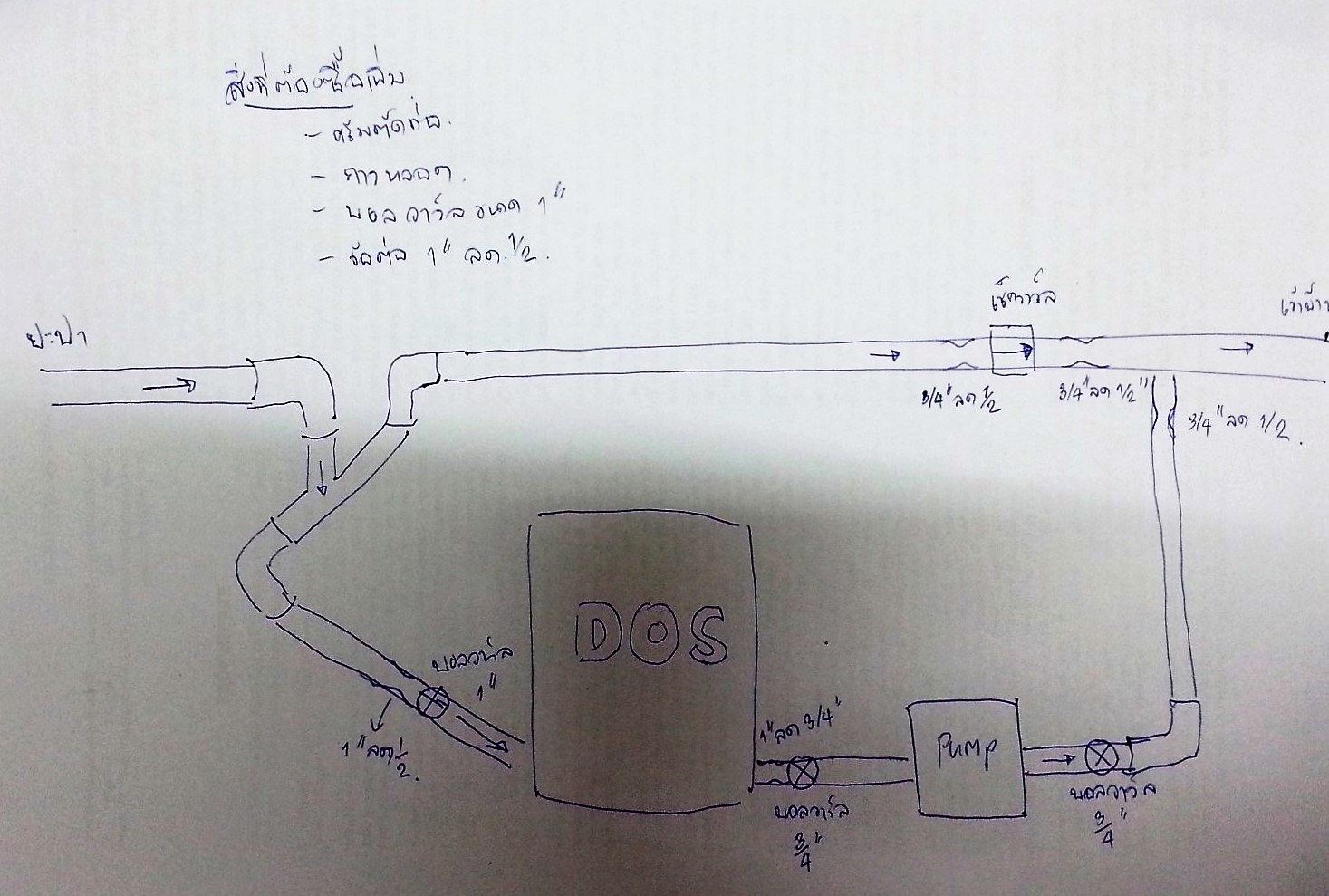 พอดีบ้านเกิดเมืองนอนอยู่บ้านนอกมากจะหาช่างที่พอรู้เรื่องก็ยากเย็นแสนเข็ญ เคยพาช่างมาดูหนนึงช่างบอกต้องใส่วาล์ตรงท่อน้ำเข้าถังเพื่อไม่ให้น้ำไหลย้อนกลับต้องเคยมาเปิดปิดวาล์ว เอิ่มมมมม....ได้ยินแบบนี้ก็เลยตัดสินใจทำเองดีกว่า ขอเล่าถึงความพิเศษของระบบน้ำบาดาลในหมู่บ้านก่อนนะคะ คือเนื่องจากน้ำขาดแคลนน้ำบาดาลในหมู่บ้านจึงต้องเปิดปิดเป็นเวลา คือจะเปิดให้ใช้เฉพาะตอนเช้ากับเย็น แม่ก็เลยต้องคอยมารองน้ำไว้ใช้ซึ่งท่านก็เดินเหินไม่ค่อยจะสะดวกเลยเป็นสาเหตุให้ต้องทำถังเก็บน้ำไว้เผื่อใช้ในระหว่างวันหรือถ้าวันไหนลืมเปิดก็อกน้ำในบ้านไว้เพื่อรองน้ำก็จะได้พอมีน้ำในถังสำรองไว้ใช้แต่มีข้อจำกัดตรงที่ตำแหน่งการวางของถังถูกกำหนดไว้แล้วเปลี่ยนแปลงไม่ได้ และจะต้องต่อโดยรื้อแนวท่อเดิมให้น้อยที่สุดจึงทำให้ได้ผังการต่อออกมาดังรูป รบกวนท่านผู้รู้ชี้แนะด้วยนะคะ......ขอบคุณค่ะ