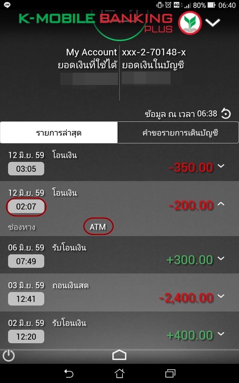 พอเปิดมือถือมาแม่เจ้าทำไมเงินหายไป แถมมีรายการไปถอนด้วย ATM ตอนตี 2 และ ตี 3 ของเช้าวันนี้ด้วย เคราะห์ดีที่ไม่ได้โอนเงินเข้ามาเก็บไว้ในบัญชีนี้เท่าใด เอาไว้โอนเงินค่าสินค้าทางเน็ตเฉยๆ เงินที่หายไปมี 2 รายการรวม 550 บาท แถมไม่มี sms แจ้งเตือนอะไรด้วย ???