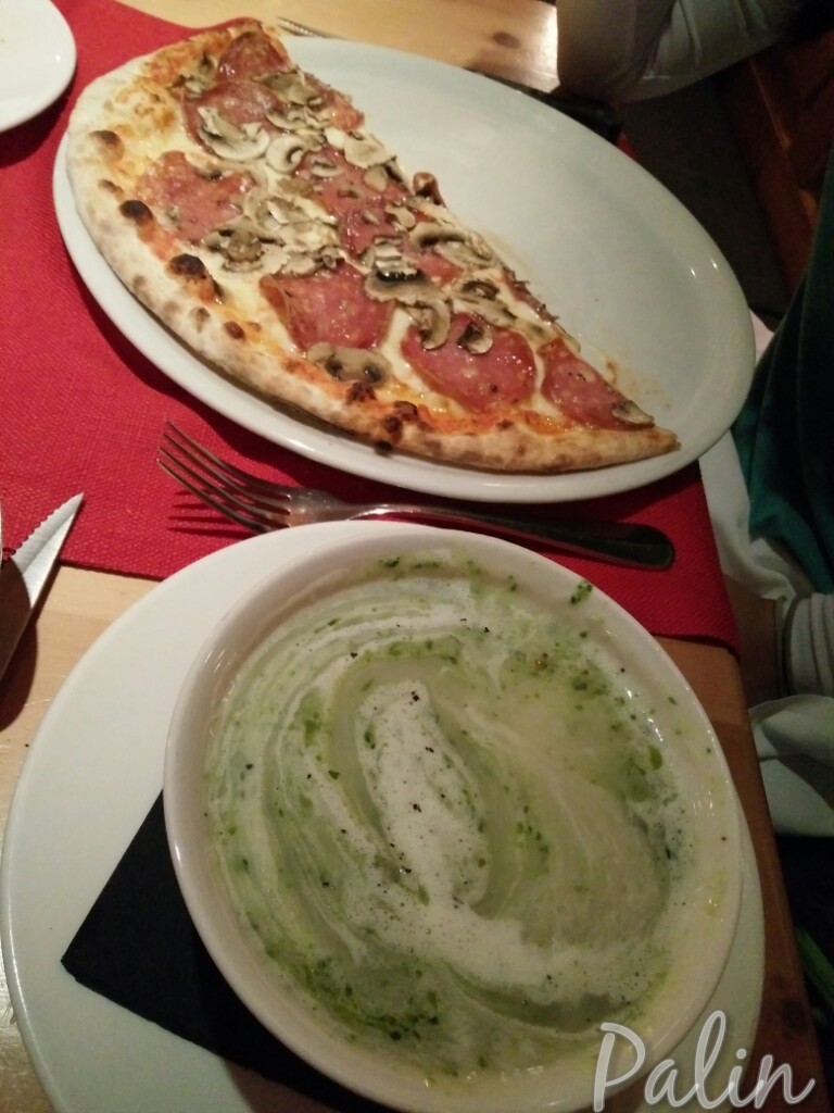 เราเดินลงเนินย้อนลงไปตามทางที่รถบัสแล่นมา แล้วตรงๆๆไปเรื่อยๆ ตรงอย่างเดียวห้ามเลี้ยวไปไหน ประมาณ 7-8 นาที (800) เมตร ก่อนถึงสปาจะเจอทางแยกเล็ก มีป้ายบอกทางไป โรงแรม Laudinella เลี้ยวซ้ายไปตามป้าย ลงไปที่ชั้นใต้ดินจะมีร้านพิซซา ที่คนเฝ้าที่พักแนะนำให้มาลองชิม ในร้านก็ว่อนไปด้วยภาษาอิตาเลียน หึ หึ แน่นอนค่ะ ว่าฟังไม่ออก (แถบนี้เค้าพูดอิตาเลียนกัน ) แต่ใช้ภาษาอังกฤษสื่อสารได้ สั่งพิซซามา 1 ถาด ราคา 19 CHF แบ่งกันกินสองคน (ไม่หมดค่ะ ห่อกลับ ได้กินบนรถไฟวันถัดมา) เพื่อนสั่งซุปมา 1 ถ้วยเป็นซุปแอสพารากัส นางอยากซดซุปร้อนๆ ส่วนเราอยากลองเบียร์ของที่นี่ สั่งมาแบ่งกัน 1 แก้ว แบบว่าเน้นชิม ไม่เน้นเมา (เสียดายลืมถ่ายเบียร์มา)