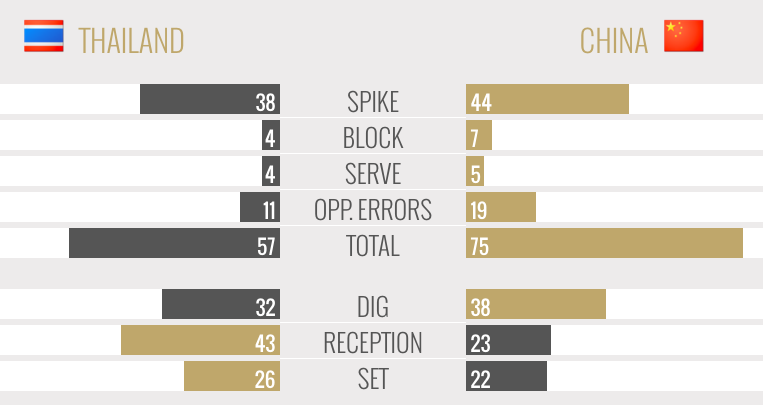 Thailand🇹🇭 3-1 Belgium🇧🇪 (20-25 25-20 25-23 25-17) Team Stats Attack 🇹🇭46 🇧🇪48 Block 🇹🇭11 🇧🇪10 Serve 🇹🇭9 🇧🇪8 Error 🇹🇭19 🇧🇪29 Dig 🇹🇭61 🇧🇪59 Reception 🇹🇭69 🇧🇪86 Set 🇹🇭102 🇧🇪112 ไทยดีกว่า4/7สกิล 57.1%