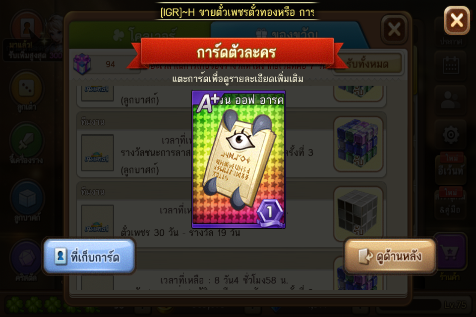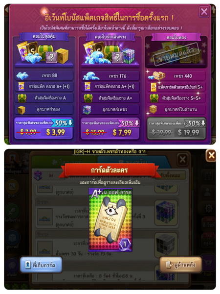 รวมการ์ดA20ทั้งหมดก็58ใบเอ๊งงงงง เป็นทองเท่าไหร่ก็ไม่รู้ คำนวนไม่เก่ง รู้แค่ว่าเยอะมาก ขายการ์ดS+30 ขายเต๋า ขายเจมพิเศษ เจมธรรมดา ขายการ์ดs