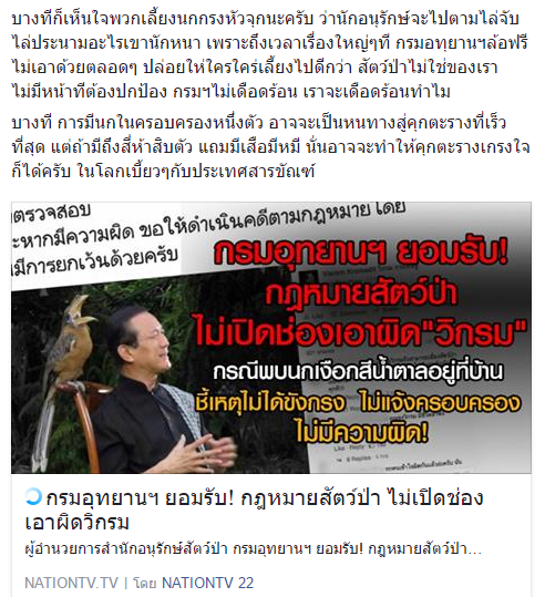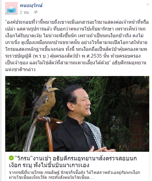 . จากกรณีเฟซบุ๊กแฟนเพจ คนอนุรักษ์ ได้โพสต์ภาพของ ‘วิกรม กรมดิษฐ์’ ที่ถ่ายภาพคู่กับ ‘นกเงือกสีน้ำตาล’ ซึ่งเป็นสัตว์ป่าคุ้มครอง พร้อมตั้งคำถามว่า นักธุรกิจชื่อดังท่านนี้ ครอบครอง