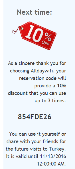 แล้วพอดีวันนี้ทางนั้นเค้ามี code ส่วนลดมาให้ 10% สำหรับการใช้บริการครั้งต่อไป หมดเขตวันที่ 13/11/2016 ซึ่งผมคงไม่ได้ไปตุรกีอีกเร็วๆนี้