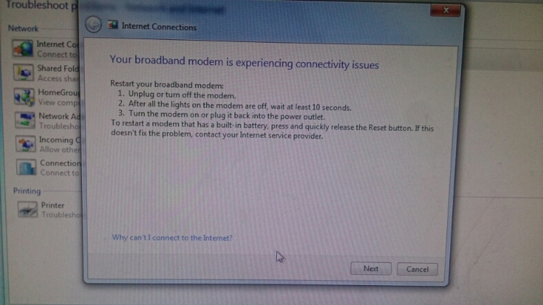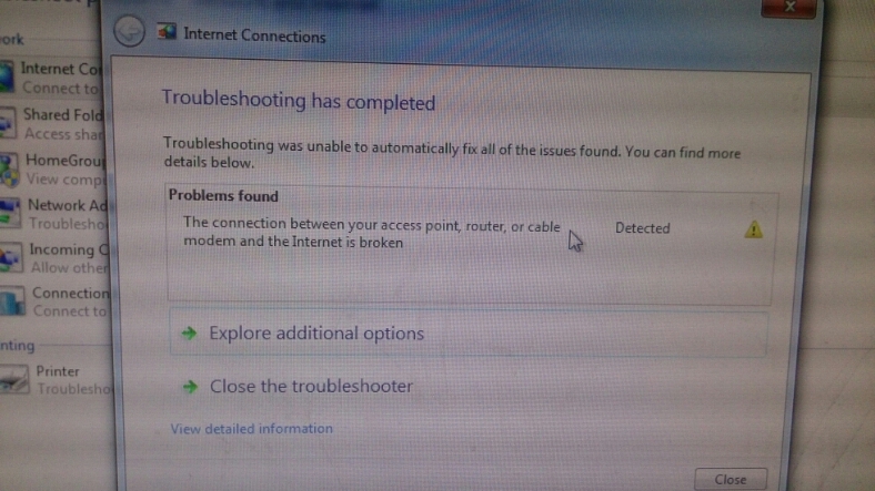 เนื่องจากตัว ups ที่ใช้สำหรับ modem และ switch เสีย และเมื่อบ่ายไฟดับ ทำให้มีปัญหาเชื่อมต่ออินเตอร์เนต โดยมันขึ้นเครื่องหมายตกใจสีเหลือง