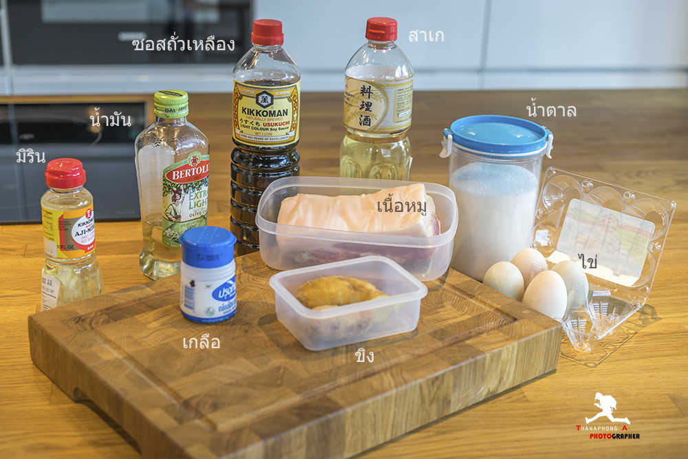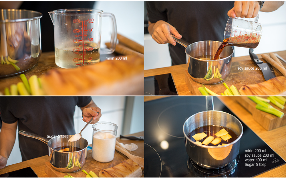 ทีนี้ก็นำ สาเก 200 มล., ซอสถั่วเหลือง (ญี่ปุ่น) 200 มล., น้ำเปล่า 400 มล. และ น้ำตาล 5 ช้อนโต๊ะ ใส่ลงไปในหม้อ คนให้เข้ากัน ใส่ แกนกลางของต้นหอม และขิงลงไป