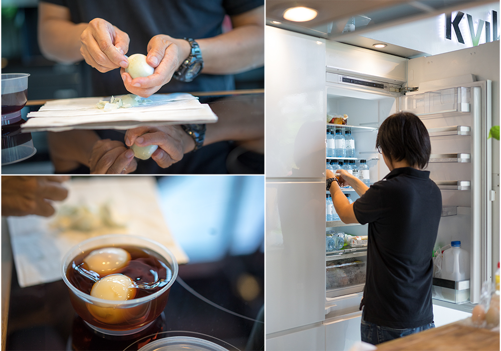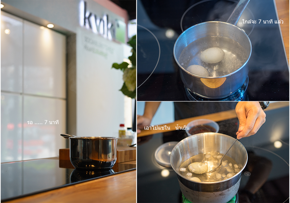 พอเราต้มไข่จนได้ที่แล้ว ให้นำไข่ ย้ายไปลงในน้ำเย็นทันที แล้วจึงปลอกเปลือก ไข่ เอาไข่ที่ปลอกเปลือกแล้วแช่ไว้ในน้ำซอสที่เราเตรียมไว้ในครั้งแรก ครับ จากนั้นเอาเข้าตู้เย็นไว้ได้เลย พอจะกินก็ค่อpเอาออกมาผ่า
