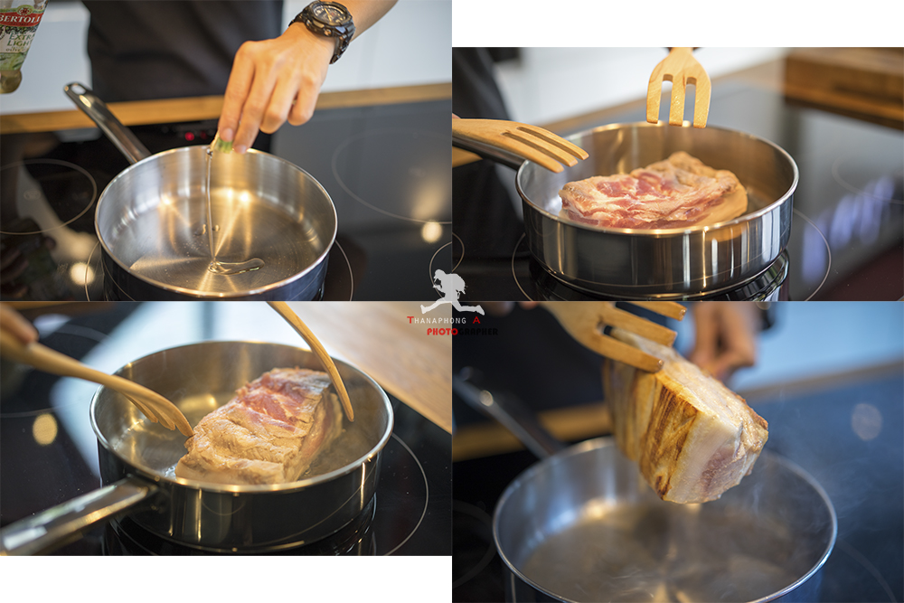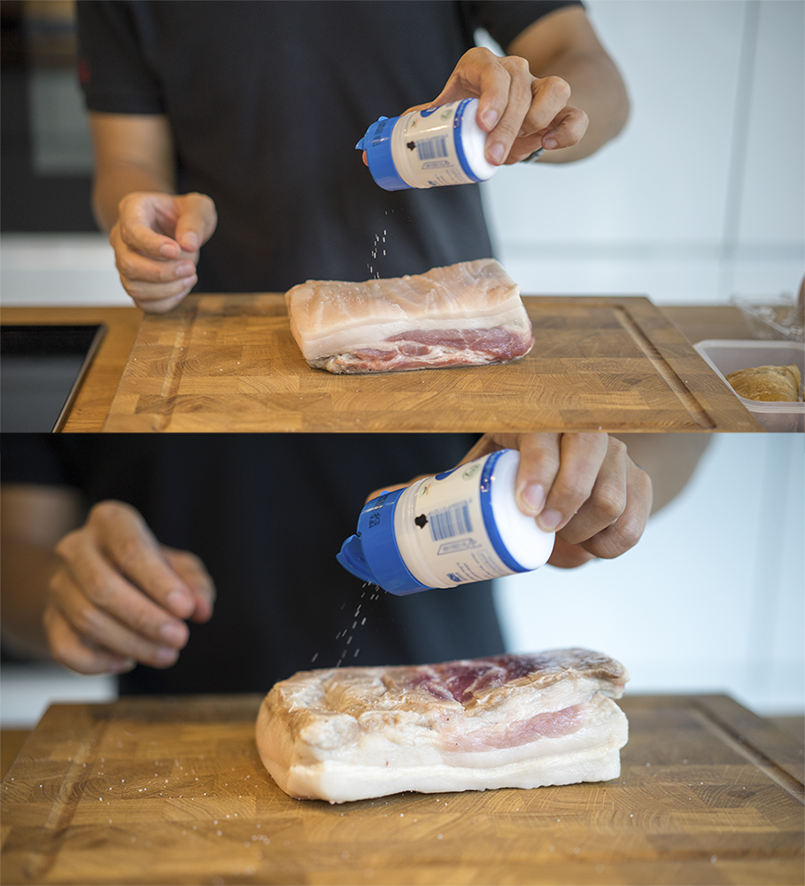 ผมเลือกหมูสามชั้น ลอกหนังด้านบนออก น้ำหนัก ประมาณ 600 กรัม นำมาโรยเกลือเล็กน้อย ทั้งสองด้าน และนำไป เบิร์น ผิวของหมู โดยการใส่น้ำมันเล็กน้อย เพื่อไม่ให้หมูติดกระทะ และทำการเบิร์นทั้งสองด้านด้วยนะครับ เพื่อให้ดูน่าทานมากยิ่งขึ้น
