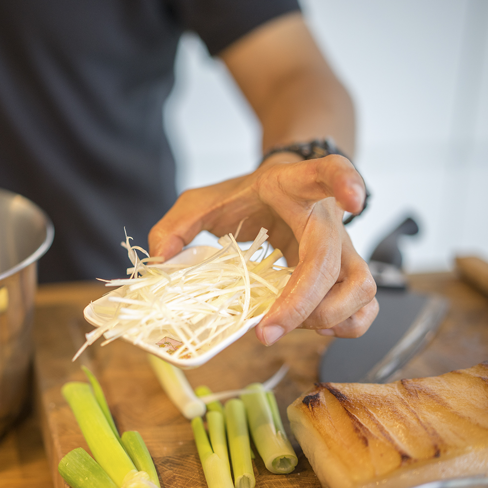 เมื่อ เบิร์น เรียบร้อยแล้ว ทีนี้เราก็จะมาเตรียมน้ำซุปเพื่อต้มหมู่กัน โดยเริ่มจากการหั่นต้นหอมญี่ปุ่นเป็นแท่งๆ ยาวประมาณ 2 นิ้ว 3-5 แท่ง แล้วเอามีดกรีดตรงกลาง เอาเปลือกชั้นนอกสีขาวนวล ออกมาทำการซอยเป็นเส้นๆ และนำไปล้างเอา ยาง ของต้นหอมออกซะหน่อย จากนั้น ก็พักใส่จานเล็กไว้ เราจะเอาเปลือกนอกต้นหอมซอยนี้ไว้โรยตกแต่งจานในตอนท้ายครับ