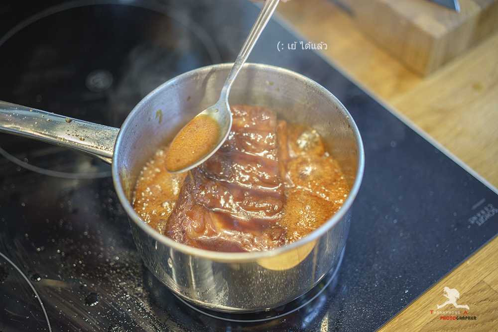 นำหมูที่เรา เบิร์น เตรียมไว้แล้ว ลงไปต้มในหม้อใช้ไปไม่ต้องแรงมากนะครับ ต้มประมาณ 45 นาที ถึง 90 นาที นะครับ ยิ่งต้มนาน หมูยิ่งนุ่ม ถ้าจะให้นุ่มจนเปื่อยละลายในปาก ก็ราวๆ 4-6 ชั่วโมงอ่ะครับ
